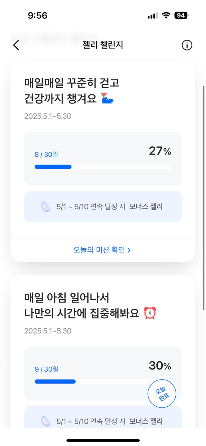 기상시간을 지정해두고 그 시간에 일어나서 출석을 하면 미션 완료이고 걷기는 하루에 5 천보 이상 걷게 되면 미션 완료입니다. 완료하게 되면 파란색 캔디를 하나씩 주고 4주 연속 미션을 완료하게 되면 스페셜 캔디를 받게 됩니다.