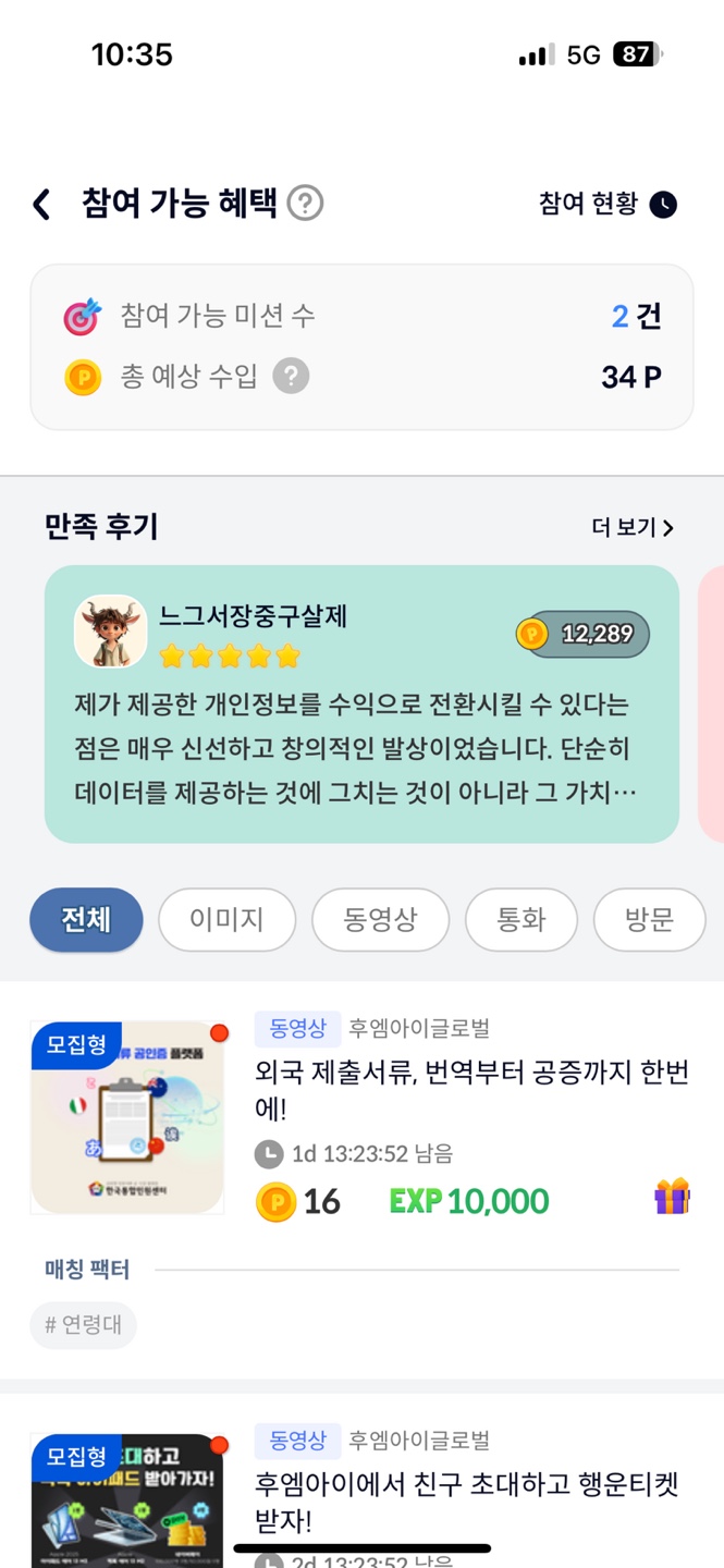 매일 제공되는 미션(예: 영상 좋아요, 댓글 달기, 팔로우 등)을 수행하면 추가 포인트를 획득할 수 있습니다.