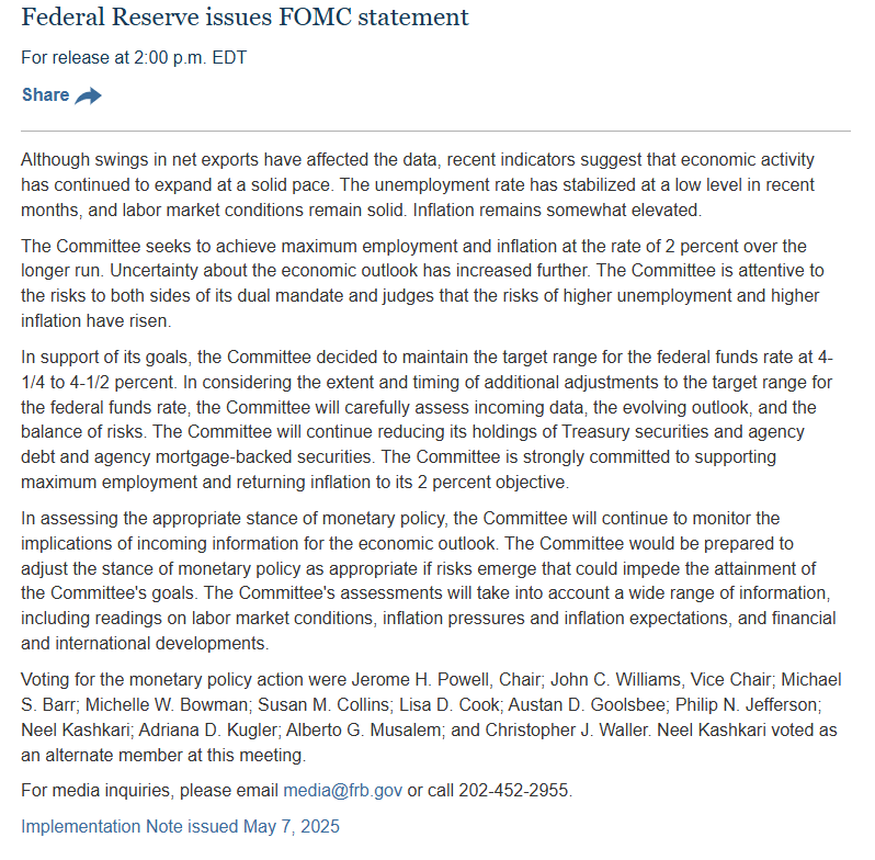 2025년 5월 7일, 미국 연방준비제도(Fed)는 연방공개시장위원회(FOMC) 정례회의에서 기준금리를 현재의 4.25%~4.5%로 동결하기로 결정했습니다. 이는 3회 연속 동결 조치로, 최근 도널드 트럼프 행정부의 관세 정책으로 인한 인플레이션과 경기 둔화 우려가 동시에 커지는 상황에서 신중한 접근을 택한 것으로 보입니다.