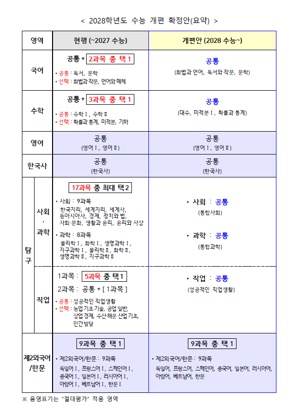 - 기존의 선택과목제를 폐지하고 공통과목 기반으로 통합 출제된다.