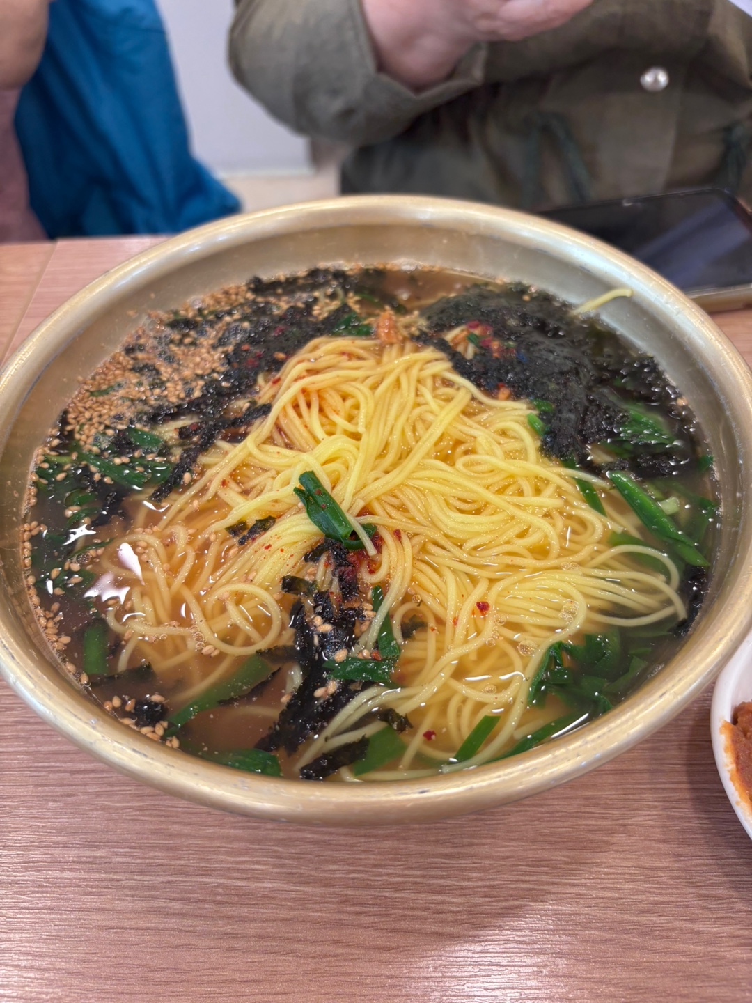 면은 굉장히 쫄깃하면서도 잘 익어 퍼지지 않았고, 부추와 김가루, 깨가 어우러져 풍미가 배가되었습니다.