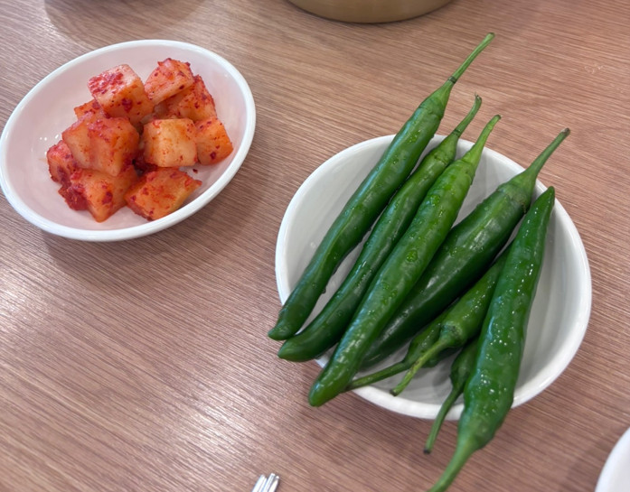 기본 반찬으로는 깍두기, 풋고추, 된장이 제공되었는데, 특히 깍두기가 아주 맛있었습니다.