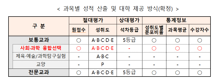 - 사회·과학 융합 선택과목은 상대평가 병기 없이 절대평가만 실시